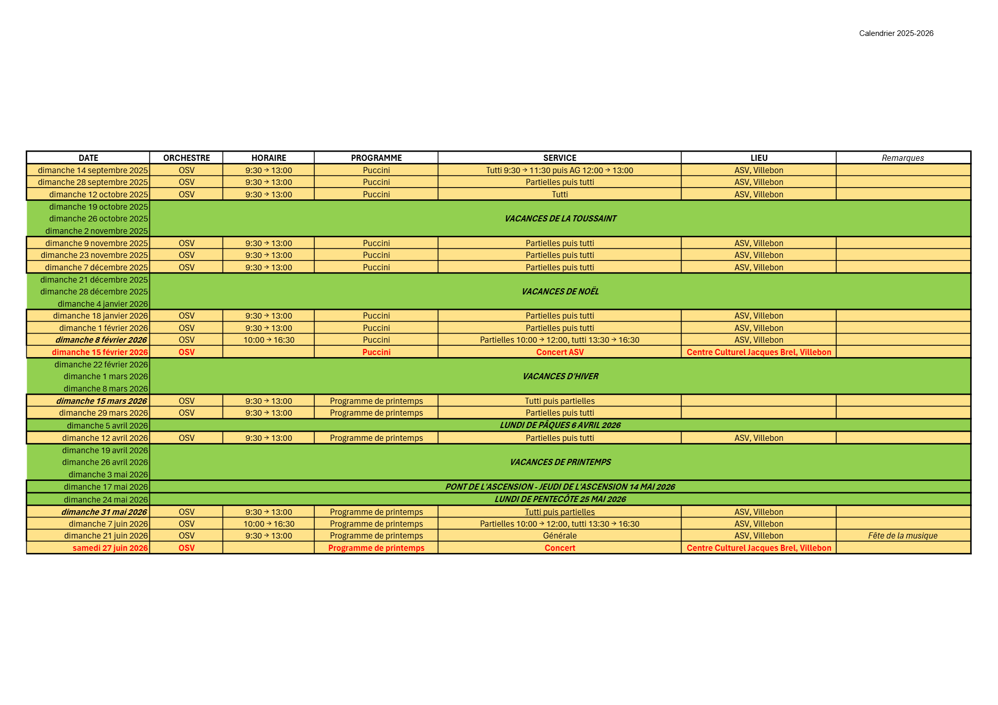 Les répétitions (deux fois par mois le dimanche matin, soit de 9h30, soit de 10h à 13h) hors vacances scolaires.